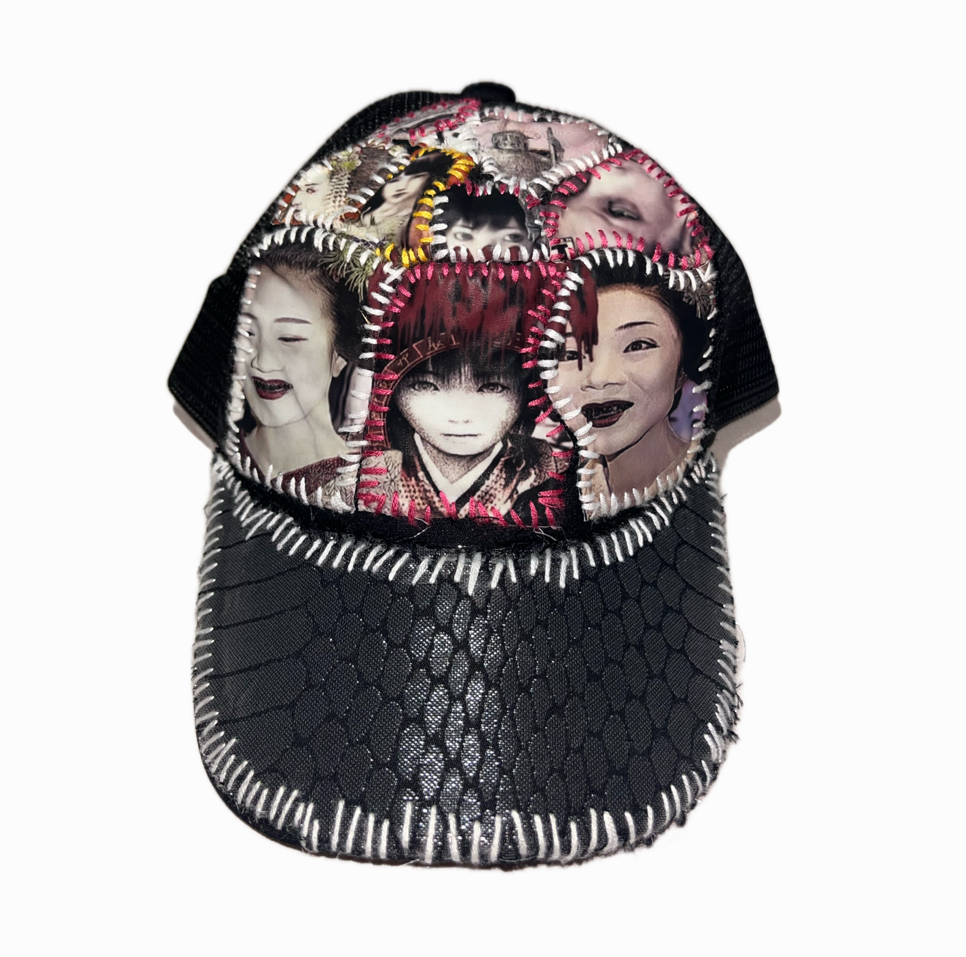 Handcrafted patchwork cap with a one-of-a-kind brim wrapped in authentic kimono fabric.